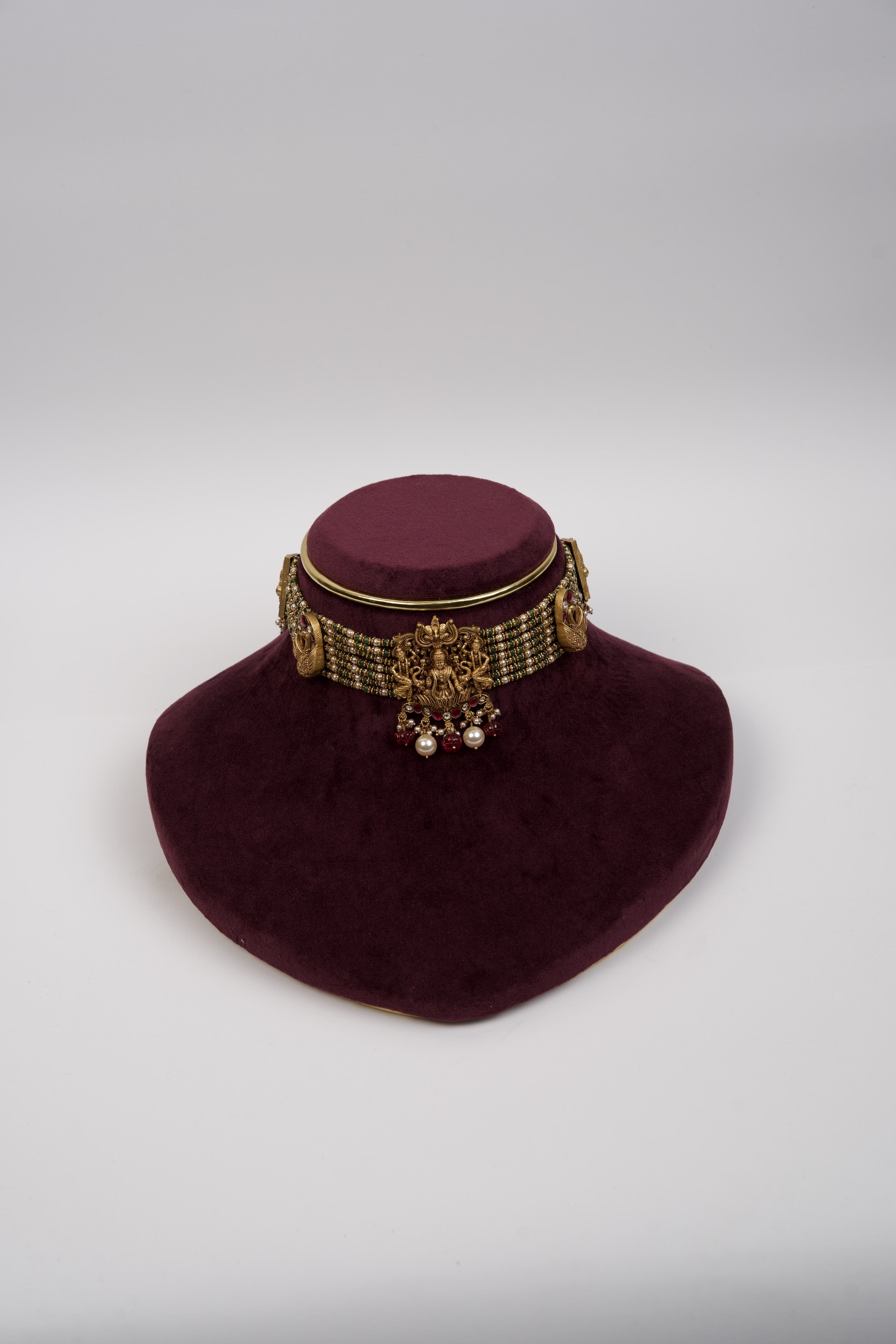 The choker is a bold and regal ornament that sits closely on the neckline, making it a statement piece in South Indian tradition. Richly crafted with intricate patterns, it is especially favored for bridal wear and grand festivities. The choker frames the face beautifully and layers effortlessly with longer ornaments, making it an essential piece for creating a complete and luxurious look.
