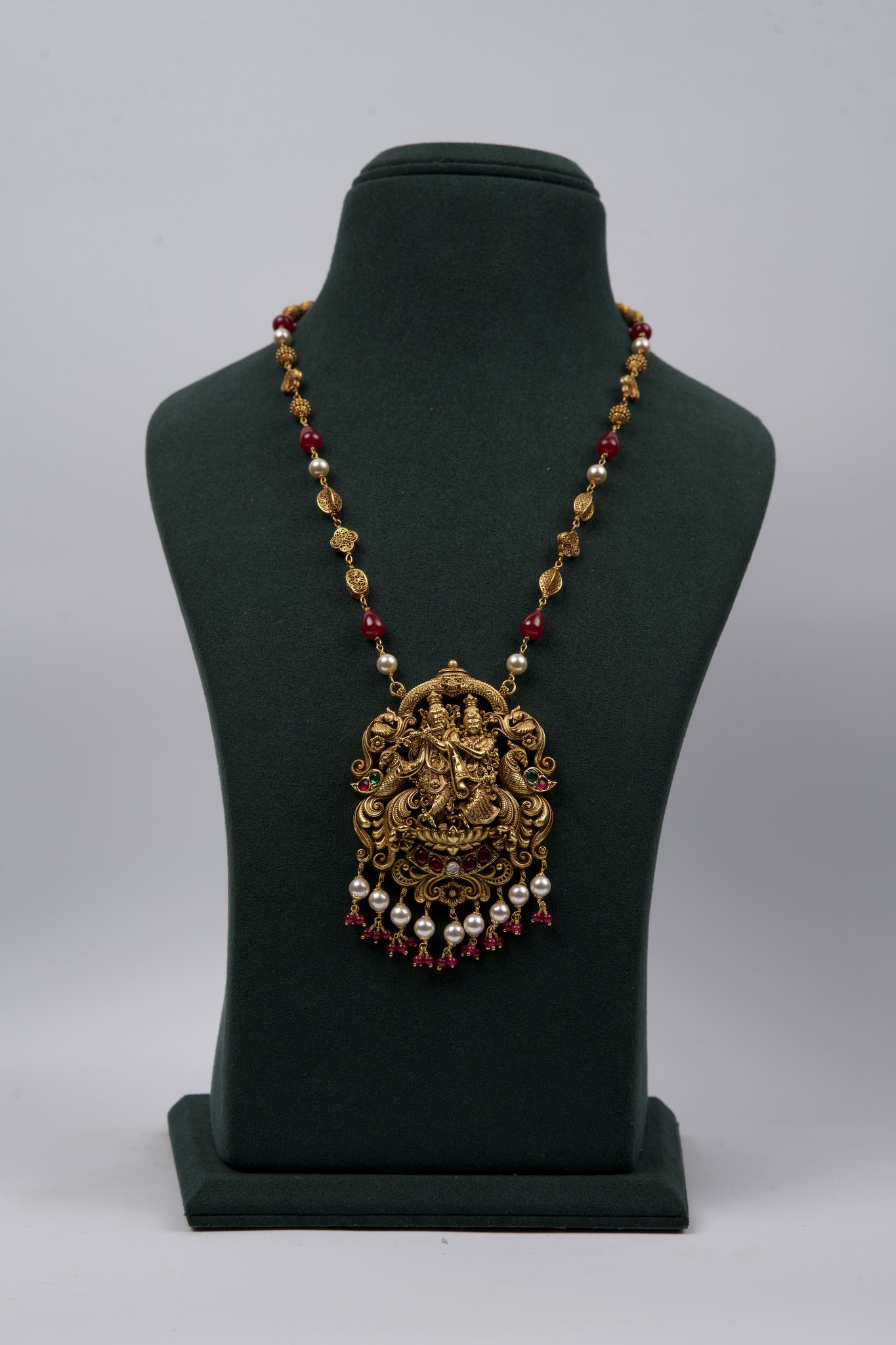 Pendants with mala unite the elegance of intricate central motifs with the grace of flowing strands. Inspired by temple artistry, these designs reflect sacred symbolism while bringing harmony and grandeur to traditional attire. Whether worn as a singular highlight or layered for a regal look, they embody devotion, beauty, and timeless craftsmanship.