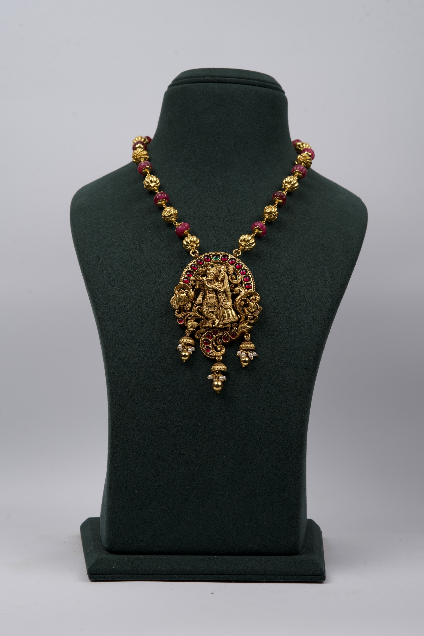 Pendants with mala unite the elegance of intricate central motifs with the grace of flowing strands. Inspired by temple artistry, these designs reflect sacred symbolism while bringing harmony and grandeur to traditional attire. Whether worn as a singular highlight or layered for a regal look, they embody devotion, beauty, and timeless craftsmanship.