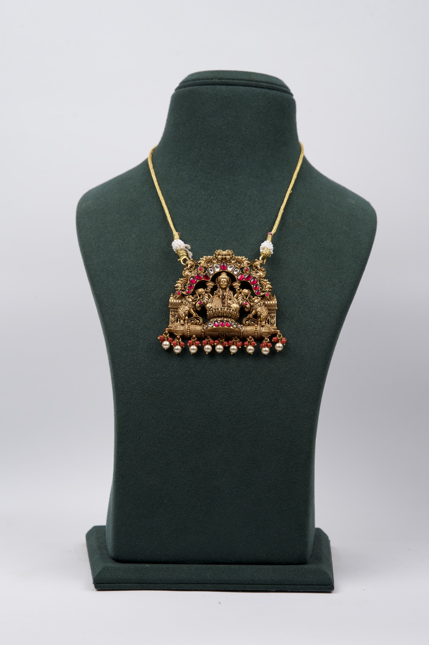 Pendants with mala unite the elegance of intricate central motifs with the grace of flowing strands. Inspired by temple artistry, these designs reflect sacred symbolism while bringing harmony and grandeur to traditional attire. Whether worn as a singular highlight or layered for a regal look, they embody devotion, beauty, and timeless craftsmanship.