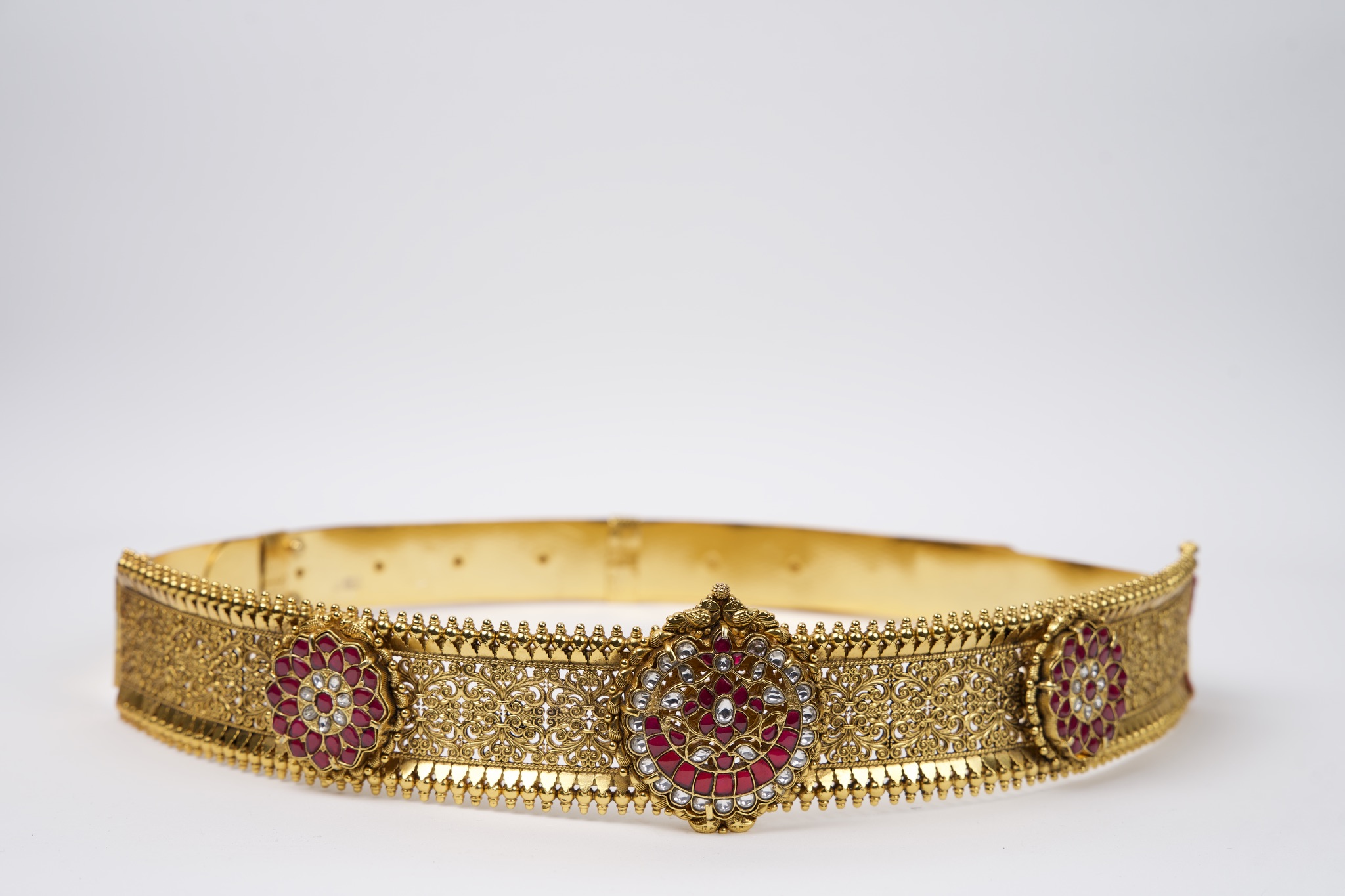 The vadana, or waist belt, is a symbol of grace, strength, and tradition in South Indian culture. Worn around the waist, it not only secures the drape of sarees but also accentuates the elegance of the attire. Often reserved for weddings and special ceremonies, the vadana is associated with prosperity and feminine beauty, completing the look with an aura of majesty and cultural pride.