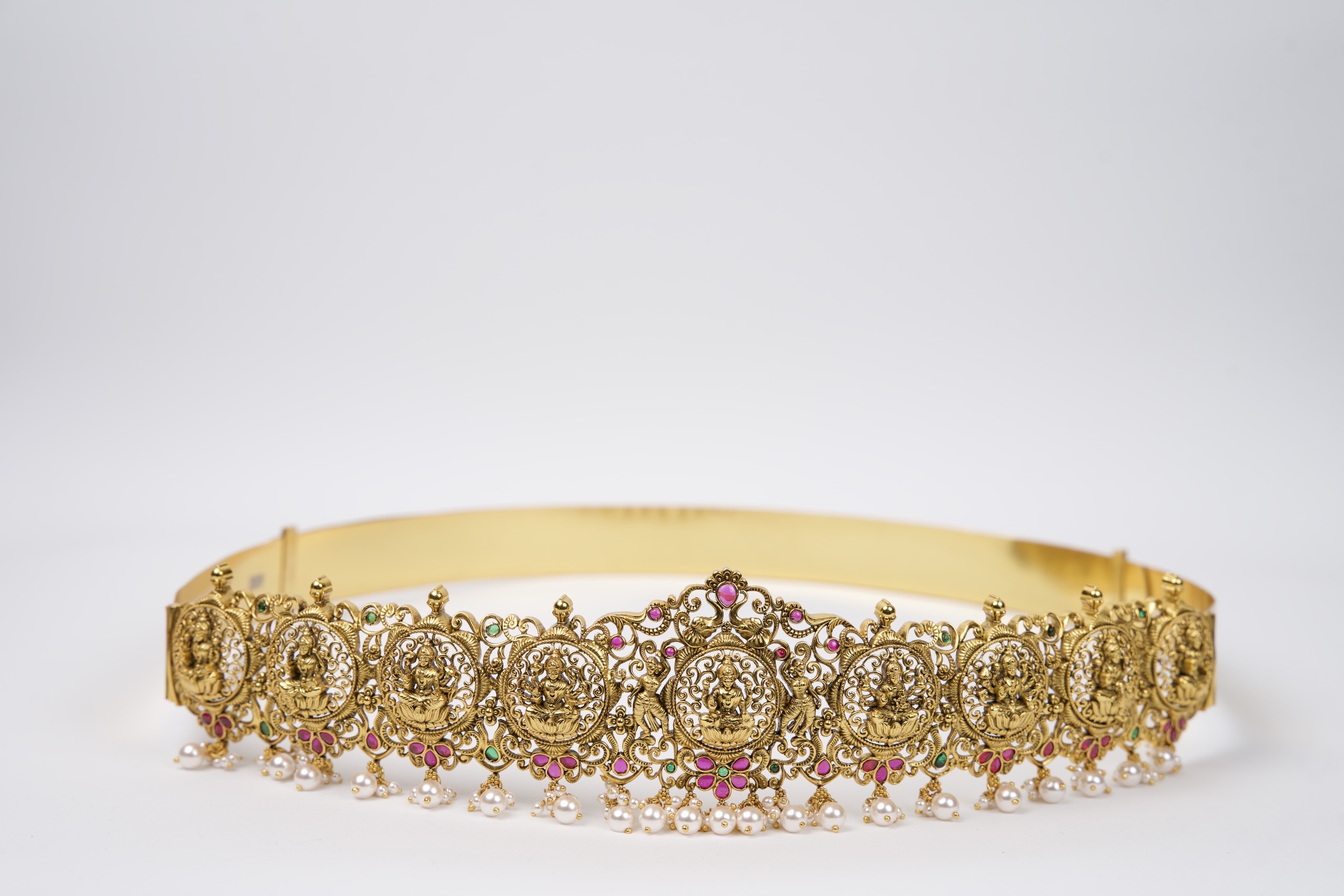 The vadana, or waist belt, is a symbol of grace, strength, and tradition in South Indian culture. Worn around the waist, it not only secures the drape of sarees but also accentuates the elegance of the attire. Often reserved for weddings and special ceremonies, the vadana is associated with prosperity and feminine beauty, completing the look with an aura of majesty and cultural pride.